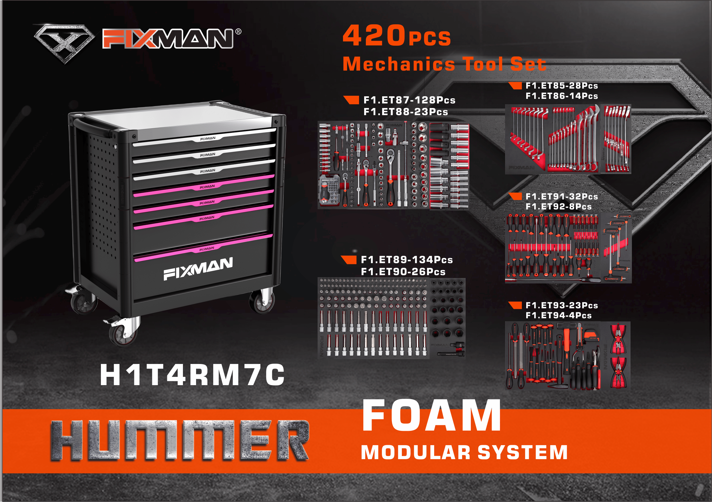The FIXMAN 7-Drawer Roller Cabinet H1T4RM7C (with 420-piece tool set) is a high-capacity, professional-grade mobile tool workstation featuring centralized locking, heavy-duty full-extension slides, and an industrial-strength build—designed for automotive dealerships, heavy equipment service centers, aviation ground crews, and advanced manufacturing facilities requiring comprehensive, instantly accessible tool organization at scale.