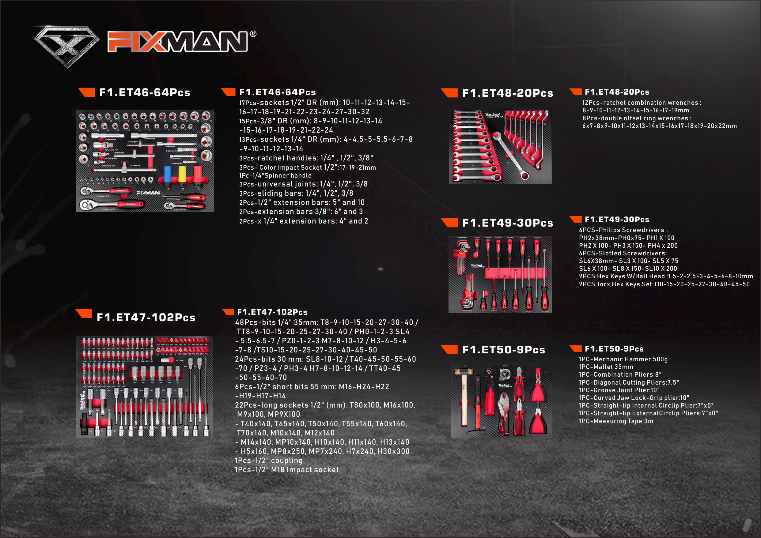 The FIXMAN 7-Drawer Roller Cabinet M1RM7E (with 225-piece tool set) is widely used in automotive service centers, mechanical repair shops, industrial production lines, and field technician operations to centrally store, quickly access, and securely manage hand tools and accessories—enhancing workflow efficiency and workplace organization.